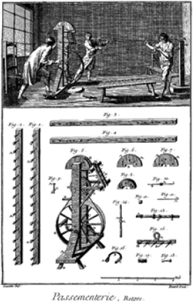 Representación en de una máquina de pasamanería en L'Encyclopédie