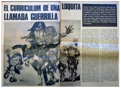 Si bien la discursividad del ECTP da cuenta de la incorporación de las mujeres en la esfera pública, su función en el ámbito doméstico se presentó como irrenunciable. Por lo tanto, lejos de poder elegir entre ambas dimensiones, la mujer debió maximizar -doblar- sus esfuerzos en pos del bien común. Allí se puso de ejemplo a Eva e Isabel, al destacar su actitud serena y de templanza propia de su género. Para ECTP ellas fueron las que demostraron que la mujer estaba capacitada a la par del hombre para guiar los destinos de la nación. En consonancia con lo anterior, la alusión a la prostitución fue recurrente dentro de la caracterización del enemigo. No solo la práctica se consideraba aberrante, sino que las prostitutas representaban el último escalafón dentro del mundo femenino. En el Número 1 (1973) de la revista, la sección "El curriculum de una loquita llamada guerrilla" da cuenta de ello (figura 1). En la ilustración que inicia el artículo se caricaturizó a integrantes de agrupaciones guerrilleras. En el centro de la parodia, un líder guerrillero se abalanza por encima de una mujer, que mientras es tocada por debajo de su prenda, parece disfrutar y celebrar el acto en cuestión. Así, se representó a la guerrilla delineada como mujer que vende su cuerpo y se permite morbosidades: "Loquita, incapaz de actuar en público si no es bajo un antifaz (como aquellas prostitutas que aparecían fotografiadas antes)"32.
