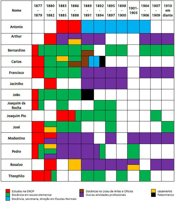 Fontes: Almanaques de Minas Gerais; Periódicos do Rio de Jane iro e Minas Gerais; Relatórios da Presidência na Assembleia Legislativa Provincial de Minas Gerais; APM, Fundos: Instrução Pública - IP e Secretaria do Interior - SI: Livros de matrícula da Enop; Livros de matrícula de professores das escolas primárias; Livros de matrícula de professores nas Escolas Normais, Atas e correspondências enviadas e recebidas pela Enop. Os quadros mesclados na vertical indicam que uma atividade ocorreu após a outra. Já os mesclados na horizontal indicam que as atividades estavam sendo efetuadas simultaneamente.