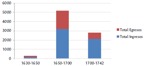 Total de ingresos-egresos de la cofradía del Rosario, 1630-1742