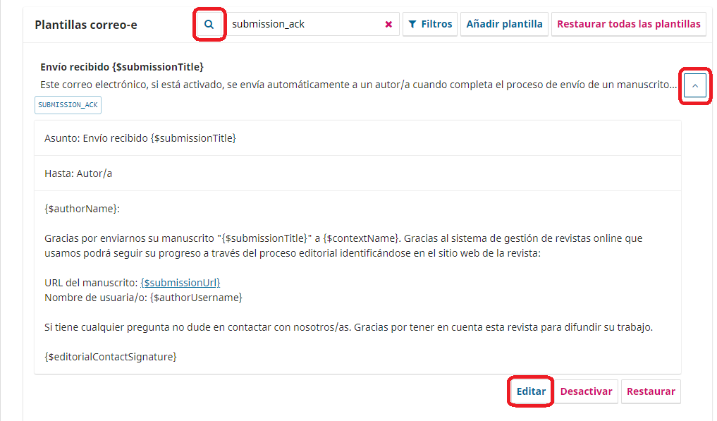 Al editarlas recuerde que debe tratar de no quitar o modificar etiquetas que van entre corchetes así: ej. {$contextName}. Estas etiquetas se van a reemplazar por los datos correspondientes del artículo, la revista, el revisor, etc. cuando se vaya enviar el mensaje.