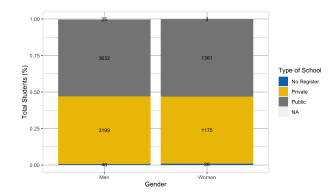 It is important to note that Score esc g [0,100] is only relative to the students that took both tests, so a comparison between both (admission and Saber Pro escalated scores) may describe a change in the academic performance by gender ( i.e., a GLS).
