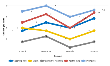 Figure 13 shows the GLS by campus. In general, the greatest jumps are seen in the Palmira campus, where gender parity is significantly higher than on the other campuses. This finding is consistent with previous research showing that academic performance tends to improve in groups with higher proportions of women (Crombie et al., 2003).