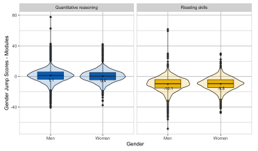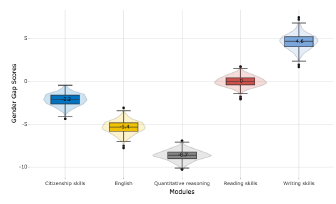 In contrast, the GLS in quantitative reasoning and reading comprehension are very similar for both genders (Figure 14). Regarding quantitative reasoning, there is no change between men and women, so the gender gap is not only almost identical, but also academic performance remains invariant (GLS close to zero) in the Saber Pro test when compared to the admission exam. On the contrary, the performance in reading comprehension tends to deteriorate along the university experience, as the GLS are negative (GLS close to -10 for both genders). However, performance deteriorates in the same proportion in men and women. These results are confirmed by the statistical tests shown in Table 3, where, for most of the skills, the means for the GLS are statistically different between men and women §. However, these differences are negligible for quantitative reasoning and reading skills, as well as small for the global score (D-Cohen result).