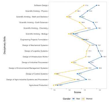 Figure 8 shows the scores in each disciplinary skill by gender. As mentioned earlier, disciplinary skills are chosen by each curricular program. In general, the GGS are in favor of men in almost all disciplinary skills except for agricultural production, engineering project formulation, and scientific thinking in biology. The highest GGS is found in design of control systems, design of industrial processes, and design of infrastructure works.