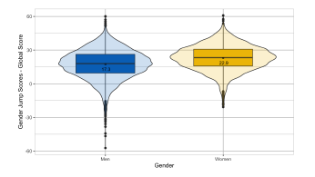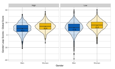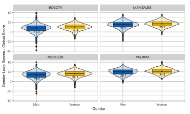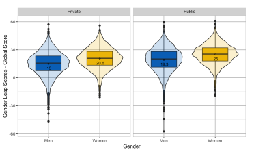 As for the GLS, Figure 9 shows the global escalated scores for both the admission and the Saber Pro tests, where there is a differentiated performance between men and women. Results suggest that the initial GGS gap in the admission test (42,8/36 points) is almost closed in the Saber Pro test (60/59). This behavior is confirmed in Figure 10, where women's leap scores (mean: 22,9) are consistently higher than those of men (mean: 17,3).