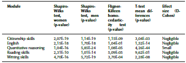 In addition, the results shown in Table 1 suggest that the difference in means (between men and women) is statistically significant according to the p-values obtained for the statistical T-test. However, the D-cohen index also suggests that the effect size is almost negligible in most of the skills except for quantitative reasoning, where the gap is considered small.