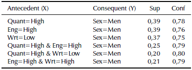 Table 9 confirms some of the results shown in the previous sections. In general, men scoring "high" in quantitative and English but "low" in writing skills is a strong rule, with a confidence greater than 75%. This result is consistent with the high GGS in favor of men for these skills, as was previously analyzed. The fact that men tend to score simultaneously high in the couples [quantitative,English] and [English,writing] but also simultaneously low in the couple [quantitative, writing] were also detected as strong rules. This result is very interesting, as it implies a certain type of association in male engineering students, suggesting that a good performance in quantitative reasoning comes along with a poor performance in writing skills.