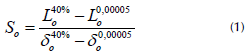 where S o is the stiffness, L 40% 0 is the load corresponding to 40% of the ultimate value, L 0 ,00005 0 is the load corresponding to 0,00005 of the ultimate value, δ 40 % is the displacement corresponding to 40% of the ultimate value, and δ 0 - 00005 0 is the displacement corresponding to 0,00005 of the ultimate value