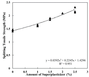 Figure 11 illustrates the results obtained regarding the splitting tensile strength of 28-day-old concrete with various concentrations of superplasticizer. The correlation coefficient between the splitting tensile strength and the amount of admixture is relatively high, reaching 95,10%. The trend identified in our study indicates that tensile strength increases along with the amount of superplasticizer. This pattern closely resembles the compressive strength testing results. It is important to recall that the addition of superplasticizers can help to reduce the water content: even though the density of concrete decreases, its compressive and splitting tensile strength increase, as less water is trapped in it and the volume of the pores is reduced. Increasing the amount of superplasticizer also increases the workability of the concrete, resulting in a more uniform aggregate distribution. This is extremely helpful for the production of lightweight, high-performance concrete. It should be noted that the resulting compressive strength is still lower than that of conventional concrete made with coarse aggregate from natural resources such as rock. However, this lightweight aggregate can also be utilized in various non-structural concrete constructions.