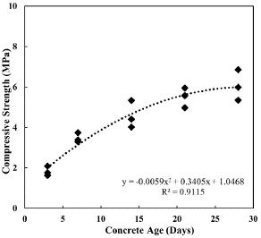 According to our results, compressive strength increases with age (Figure 12). This resembles the patterns shown by concrete with typical aggregate.