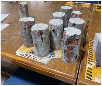 Several specimens are shown in Figure 14 after testing. It is evident that the expanded clay aggregate component of the specimen can fail, alongside the surface mortar area. As a result, a compressive strength that is often lower than that of normal concrete is reported.