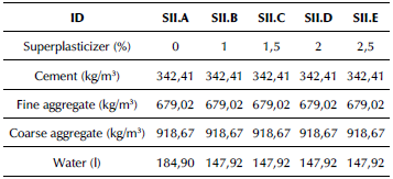 This research aimed to evaluate the effect of aggregate shape, admixtures, and age on concrete. Table 3 shows the mix proportions for series I. Table 4 presents the mix proportions for series II, which corresponds to the amount of superplasticizer used. The superplasticizer percentage was derived from the total binder used to cast the specimen.