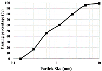 The materials used in this study were cement, water, fine aggregate, coarse aggregate, and superplasticizer. The cement used in this study was in line with the ASTM C150 standard, i.e., type 1 cement (ordinary Portland cement) (ASTM International, 2015). The fine aggregate used in this study was river sand from Kali Progo, Yogyakarta, Indonesia. Its physical and mechanical properties were examined before use as a constituent material of concrete. The evaluated mechanical parameters were water content, absorption, specific gravity, and mud content. The results are summarized in Table 1. In addition, the fine aggregate's grain particle size distribution was measured (Figure 1). These measurements were taken based on ASTM C136 (ASTM International, 2019a).