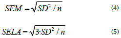 The precision of the estimates was determined by calculating the limits of agreement, the standard error of the mean (SEM), and the standard error of the limits of agreement (SELA). These limits were calculated using Equations (4) and (5), respectively.