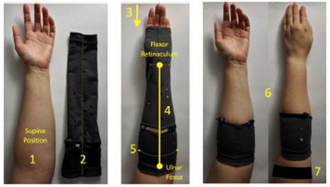 The proper placement of the FELT is the difference between useful and useless signals. A FELT positioning protocol was designed and followed each time the sleeve was used in a trial. Placing the FELT was a straightforward process, which can be seen in Figure 3. Once the sleeve is on the forearm, the most important step is to ensure proper positioning by aligning the seams of the sleeve with two anatomical points: the ulnar fossa (the middle point of the elbow crease) and the middle point of the flexor retinaculum (a transversal ligament located across the wrist).