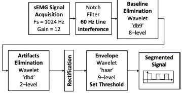 For either algorithm, the signal went through a Notch filter to eliminate the 60 Hz line interference. Then, a Daubechies wavelet 'db9' eight-level decomposition was performed for baseline elimination. Later, a wavelet Daubechies 'db4' two-level decomposition was performed to obtain the frequency range of interest for the sEMG components. The absolute value of the signal was calculated to finally go through a wavelet Haar nine-level decomposition to find the envelope. Using the last signal, a threshold was established to segment the active portion of the sEMG signals. This is depicted in Figure 5. From the segmented signal, several parameters were calculated. The parameters calculated using Equations (9) to (15) (Phinyomark et al., 2013) are shown in Table 2.