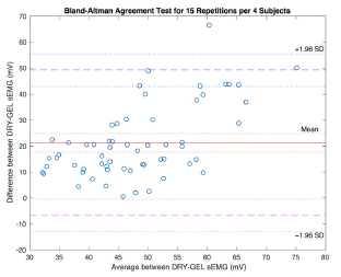 Figure 7: Bland-Altman plot of agreement. The differences between the sEMG-DRY and the sEMG-GEL electrodes are drawn against the mean of the paired measurements. For a normal distribution, at least 95% of the data are expected to land within the limits of agreement.