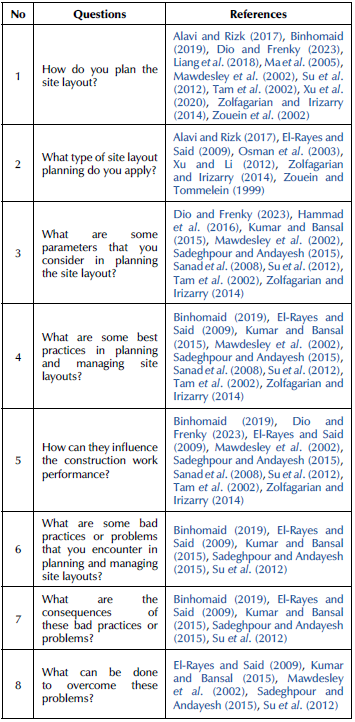 The data collection techniques consisted of site observations, document examinations, and semi-structured interviews. Site observations were carried out by visiting construction sites directly in order to gain an understanding of actual field conditions. The data collected come in the form of photos and videos. Document examinations were carried out, requesting a site layout image of each project. Meanwhile, semi-structured interviews were conducted with four project managers (one for each project). This is a small sample size, considering the narrow research scope (focused on construction site layout practices), but it includes homogeneous interviewees (project managers) with a high level of expertise (Hansen, 2021). The list of interview questions is presented in Table 2. The analysis of the interview results involved the process of familiarizing oneself with and reviewing the data. Familiarization was carried out by reading the interview transcripts repeatedly, and data analysis used coding analysis techniques.