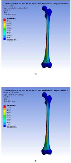 The maximum equivalent elastic strain and the stress safety factor values for the best fabricated biocomposite (20 % vol. TiO2/5% vol. Al2O3/PEEK) at compact temperature of 400 ° C reached 0,0051 mm/mm and 1,82, respectively. These equivalent elastic strains and these values are better than those obtained for the modeled natural femur bone composite by 26,09% and 5,81 %, respectively.