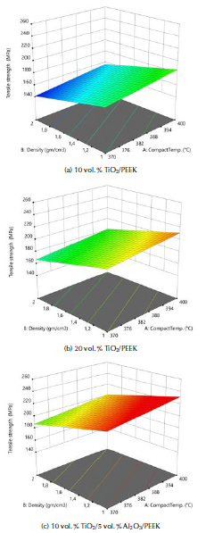 In the present work, the experiments were designed using the response surface methodology (RSM) and the full factorial method (FFM). The results were analyzed using an analysis of variance (ANOVA) technique. Table 4 presents the ANOVA analysis of the tensile strength resulting from changing the compact temperature and the density of the fabricated biocomposite materials. The F-value of 258,81 implies that the model is significant. The 3D graphs for the tensile strength of the fabricated biocomposite materials are shown in Figure 3. These graphs show that the maximum tensile strength reached 220 MPa when modelling the fabricated 20 vol. % TiO2/5 vol. % Al2O3/PEEK biocomposite material.