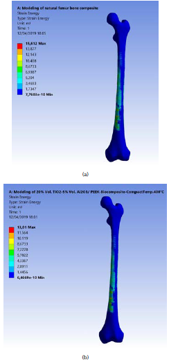 Figure 5: (a) Maximum strain energy of the natural modeled femur bone; (b) for the fabricated (20% vol. TiO2/5 % vol. Al2O3/PEEK) biocomposite at compact temperature of 400 °C.