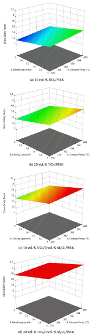 ANOVA analysis of the equivalent elastic strain and the stress safety factor values for all the examined biomaterials are listed in Tables 6 and 7. The F-values of 185,14 and 252,14 imply that the models are significant. The 3D graphs show that the equivalent elastic values increased with the decrease in the biomaterial density and in compact temperature, as shown in Figure 6. Figure 7 shows the 3D graphs of the stress safety factor values, which decreased with the increase in the biomaterial density and in compact temperature.