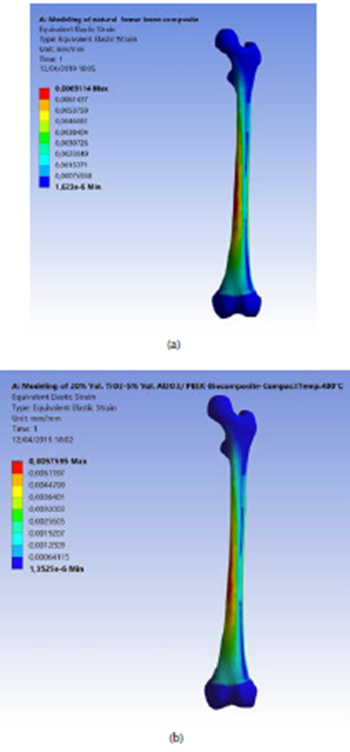 Figure 8: (a) Maximum equivalent elastic strain of the modeled natural femur bone; (b) for the fabricated biocomposite (20% vol. TiO2/5% vol. Al2O3/PEEK) at compact temperature of 400 °C.