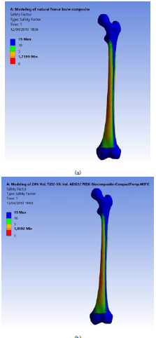 Figure 9: (a) Maximum stress safety factor of the modeled natural femur bone; (b) for the fabricated biocomposite (20% vol. TiO2/5% vol. Al2O3/PEEK) at compact temperature of 400 °C.
