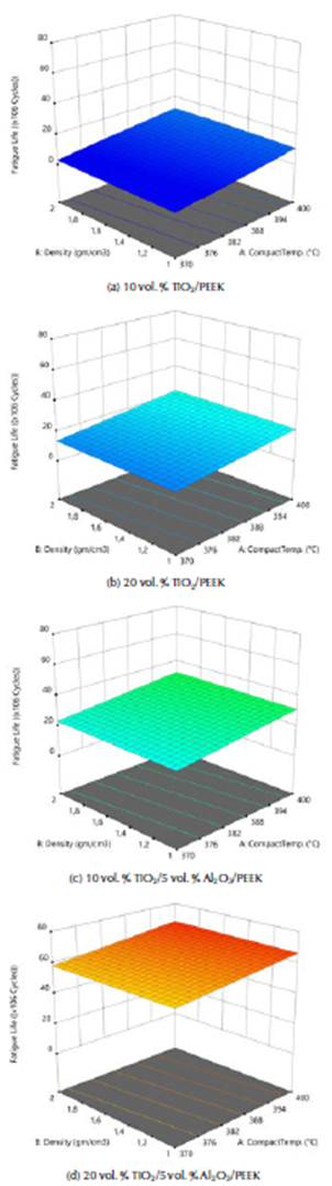 The ANOVA analyses of the values of fatigue life for the fabricated biomaterials are listed in Table 8. The model F-value of 227,69 implies that the model is significant. The 3D graphs show that the fatigue life values increased with the biomaterial density and compact temperature, as shown in Figure 10. Figure 11 shows the maximum values of fatigue lives of the modeled natural femur bone and for the best result of the fabricated biocomposite (20% vol. TiO2/5% vol. Al2O3/PEEK) at compact temperature of400 °C, reaching 50,51 and 70,93 x 106 cycles, respectively.