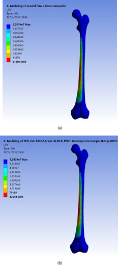Figure 11: (a) Maximum fatigue life of the modeled natural femur bone; (b) for the fabricated biocomposite (20% vol. TiO2/5 % vol. Al2O3/PEEK) at compact temperature of 400 °C.