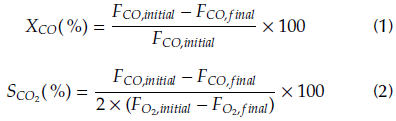 where F CO,initial and F O2,initial are the molar flows of CO and O2 in the feed stream, and F CO,final and F O2,final are the molar flows in the outlet stream.