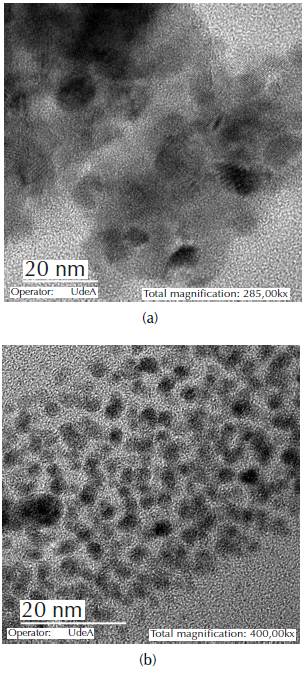 The SEM results show that the catalyst Au- CuO x /CeZr presented smaller particles formation on the larger particles of the material, while the Au/CuCeZr did not generate this type of particle. The formation of smaller particles can be attributed to the presence of CuOx on the bimetallic catalyst with impregnated copper (Au- CuO x /CeZr). Figure 3 presents the TEM results of the bimetallic catalysts.