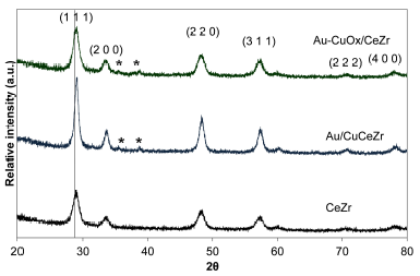 Figure 4: XRD patterns of CeZr support and the catalysts Au-CuOx/CeZr and Au/CuCeZr *CuO.