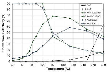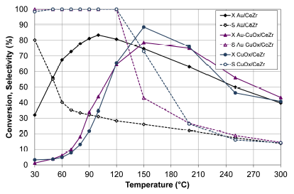 Figure 6 presents the CO conversion and selectivity to CO2 of the Au-CuOx/CeZr with respect to the monometallic catalyst of gold (Au/CeZr) and impregnated copper (CuOx/CeZr).