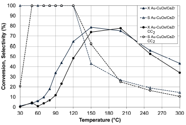 Figure 8 presents the results of CO conversion and selectivity to CO2 of Au- CuO x /CeZr, evaluating the effect of water and CO2 addition in the feed stream.