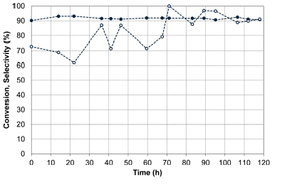 The bimetallic catalyst Au-CuOx/CeZr presented a good behavior in the stability test, with was stable for 118 h, obtaining CO conversion of 92% and selectivity of 90%, representing an ooutstanding performance. Fonseca, Ferreira et al. (2012)) evaluated a bimetallic catalyst Au-Cu over CeO2 in the presence of 10 vol. % of CO2 and 2 vol % of H2O, and reached a CO conversion of 60 % and a selectivity of 85 % during 8 h without deactivation. However, since the feed compositions evaluated in this work are quite different than those tested by Fonseca, Ferreira et al., the differences in the catalytic behavior could be related to the important role of these compounds.