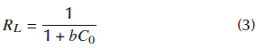 where b is the Langmuir constant and C 0 is the initial concentration of the solution. The value of R l indicates the type of isotherm: unfavorable (> 1), linear (= 1), favorable (between 0 and 1), or irreversible (= 0).