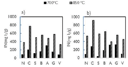 Figure 5: IN of activated carbons from original coals at temperatures of 700 and 850 °C. a) 1,5 h; b) 2,5 h.
