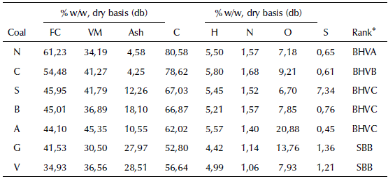 Bituminous and sub-bituminous coals from seven departments of Colombia (Antioquia (A), Boyacá (B), Cundinamarca (C), Guajira (G), Norte de Santander (N), Santander (S) and Valle del Cauca (V)) were used in this work. The coals were characterized by proximate and ultimate analyses according to ASTM standards (ASTM, 1958). The samples were crushed to particle size (< 250 m) using a disk mill.