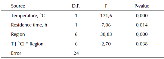 Table 3 shows the ANOVA for IN of the activated carbons. The activation temperature was the most important factor, followed by region (coal), residence time, and the interaction between temperature and region.