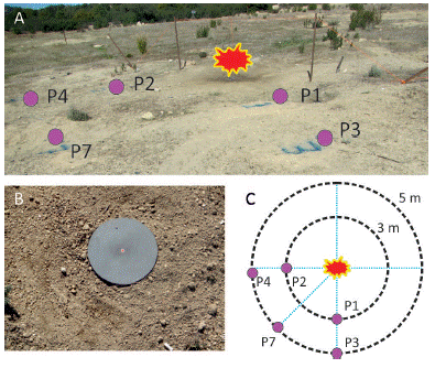 In order to measure the shock wave produced by the explosive studied, five high frequency PCB® pressure sensors were placed on a flat ground around the explosive in two concentric circles whose radios were 3 and 5 m. Two sensors were located at 3 m from the charge (called P1 and P2) and three at 5 m (P3, P4 and P7) with an angle of 0°, 45° and 90°, as Figure 1 shows.