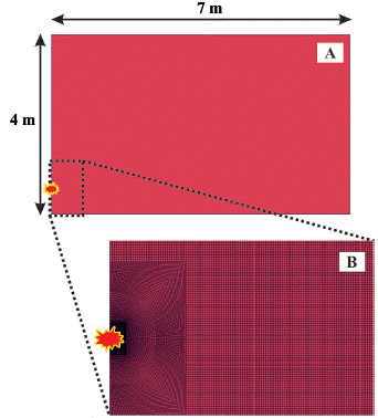 Figure 2: Model domain: (A) Numerical model domain in LS-DYNA. Note that the ProsAir domain is the same; however, the mesh cannot be seen in the software until modelling has been done. B) Mesh detail of the source point with a butterfly mesh to ensure correct wave propagation at the initial stages.