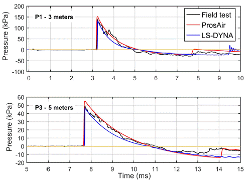 For example, pressure history at 3 and 5 meters from the experiments ProsAir and LS-DYNA is compared in Figure 3. The timing and shape of the overpressure peaks were captured accurately by the simulations. In terms of arrival time, ProsAir tends to go faster, while LS-DYNA behaves in the opposite way. The impulse, defined as the effect of the pressure over some target for a specified time period, is not compared here since the equivalent used was for the pressure peak. However, in Figure 3 it is possible to support that the impulses could be estimated with confidence, knowing that ProsAir overestimates the impulse and LS-DYNA underestimates it. These results are in accordance with others in terms of LS-DYNA and Air3D (similar to ProsAir) behavior (Huang et al., 2012; Rigby et al., 2014; Trajkovski et al., 2014).