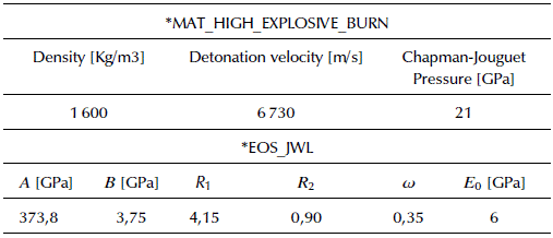 Table 1: LS-DYNA inputs for the cards *MAT_HIGH_EXPLOSIVE_ BURN and *EOS_JWL, see Equation (9)