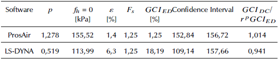 Finally, it is been verified that all solutions are within the asymptotic range of convergence, so the GCI method can be properly applied, as GCI ED and GCIDC are compared and the values obtained are similar to 1 (Table 3). Additionally, it is observed that all the estimated asymptotic solutions for the finest meshes are between the 95% confidence intervals. Remark that all the values shown in the table are estimates, and, for instance, despite the real order of convergence used with the solver LS-DYNA p = 2, the estimator (p - Table 3) gives a different value. The same happens with the ProsAir. As it is an estimator, the order of convergence is calculated by converging to different asymptotic solutions.