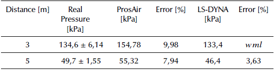 On the one hand, the LS-DYNA model gave better results, closer to the experimental pressures. One of them (3 m) was within the measurement limits and the other one had a relative error not exceeding 5%. On the other hand, the ProsAir results differ to a larger extent. Nevertheless, none of the results surpasses the 10% error, which is a very acceptable outcome in the engineering field.
