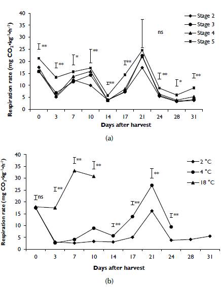 By analyzing the storage temperature factor, it was clear that the fruits stored at 18 °C had the highest value when compared to the values obtained in the fruits stored at 2 and 4 °C (Figure 3b). At 10 dah, the biggest difference was observed, with values of 3,31, 8,87, and 30,83 mg CO2 kg-1h-1 for fruits stored at 2, 4 and 18°C, respectively. Similarly, a decrease in RR was only observed in the fruits stored at room temperature (18 °C), indicating that, at this sampling point (10 dah), the senescence of fruits and loss of consumption quality began, so this treatment was discontinued.