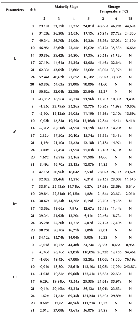 Note: dah: days after harvest; L: Lightness; a*: range from green to red; b*: range from blue to yellow; CI: color index; pH: potential hydrogen; TTA: Total titratable acidity; TSS: Total solids soluble; MI: Maturity index. N: no data for the loss of organoleptic quality. Means with different letters in the same row and classified by factor indicate significant differences between the factor levels according to the Tukey mean test (p ≤ 0,05). Source: Authors