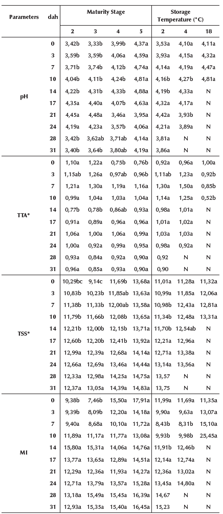 As for the temperature factor, a pH of 4,81 was observed at 10 dah in the fruits stored at 18 °C, as compared with values of 4,16 and 4,27 obtained in fruits stored at 2 and 4 °C, respectively, indicating that the fruits had higher pH when stored at ambient temperature (Table 2), in comparison with their refrigerated counterparts.